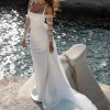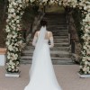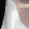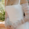 Luxe duchess satin structured silhouette. Square neckline, fitted bodice with delicate straps and gentle fit and flare skirt. Tulle sleeves and over skirt, both of which are detachable. Tulle veil included as well.