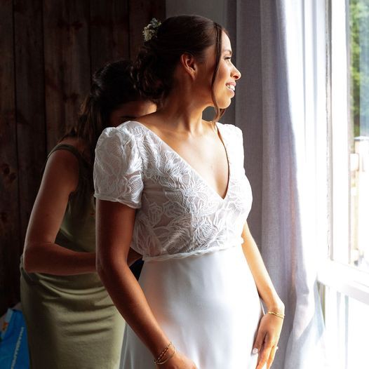 This is the Nancy by Rembo Styling, a romantic dress that’s sure to make an impression. The top is made of embroidered tulle with delicate short sleeves. It has a V-neckline in the front and the signature Rembo Styling bac. The dress was purchased in January 2024 and is part of the 2023 collection. The dress was made in Antwerp, Belgium.