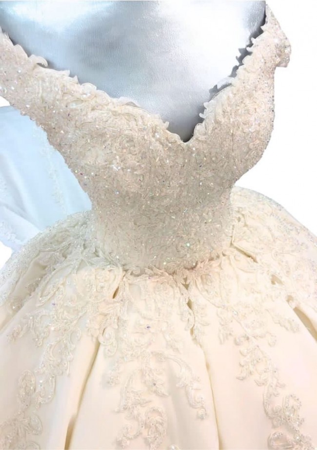 The off-the-shoulder neckline elegantly highlights the collarbones, while the corset back provides a firm and adjustable fit that enhances your natural shape.