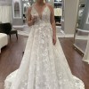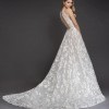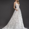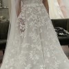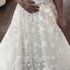 Ivory floral embroidered tulle bridal ballgown, deep sweetheart neckline with nude net insert, open keyhole back, full A-line skirt with cashmere lining and sheer pocket detail.