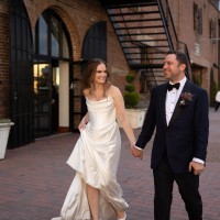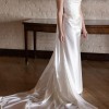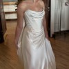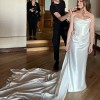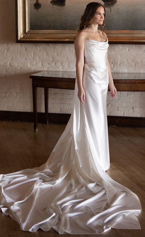 I upgraded my dress to heavy silk satin (also seen on Georgia Fowler) as opposed to the crepe/chiffon sample you will see in stores. The detachable Watteau train is the same material as the dress. This makes for a luxe, fashion forward look. This style, in color, has also been donned on the red carpet by Jessica Chastain, Claire Foy, and Alisha Boe.