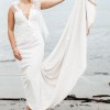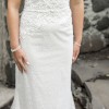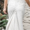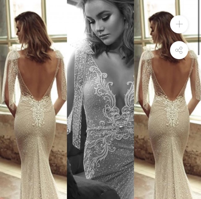 The bows on the shoulders are detachable. The train has a button to hook it up. Low v neck with nude insert. Backless. Nude under skirt with ivory sparkly over skirt.