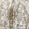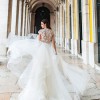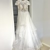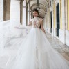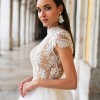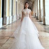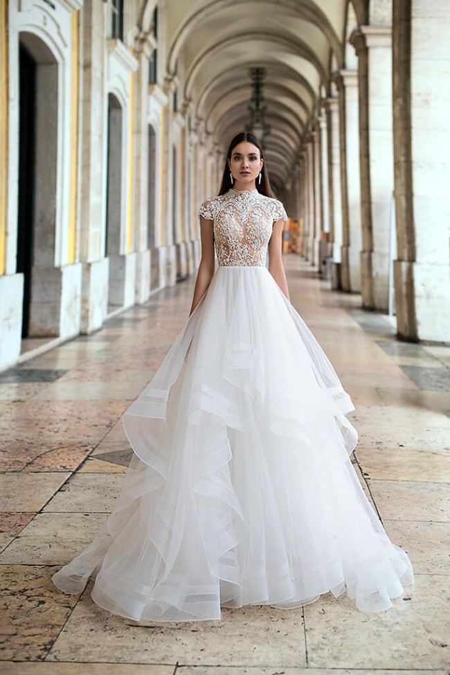 A-line dress without sleeves with upright collar, a soft bodice is decorated with lace. The layered skirt with flounces, layers of tulle are trimmed with double-regilin.