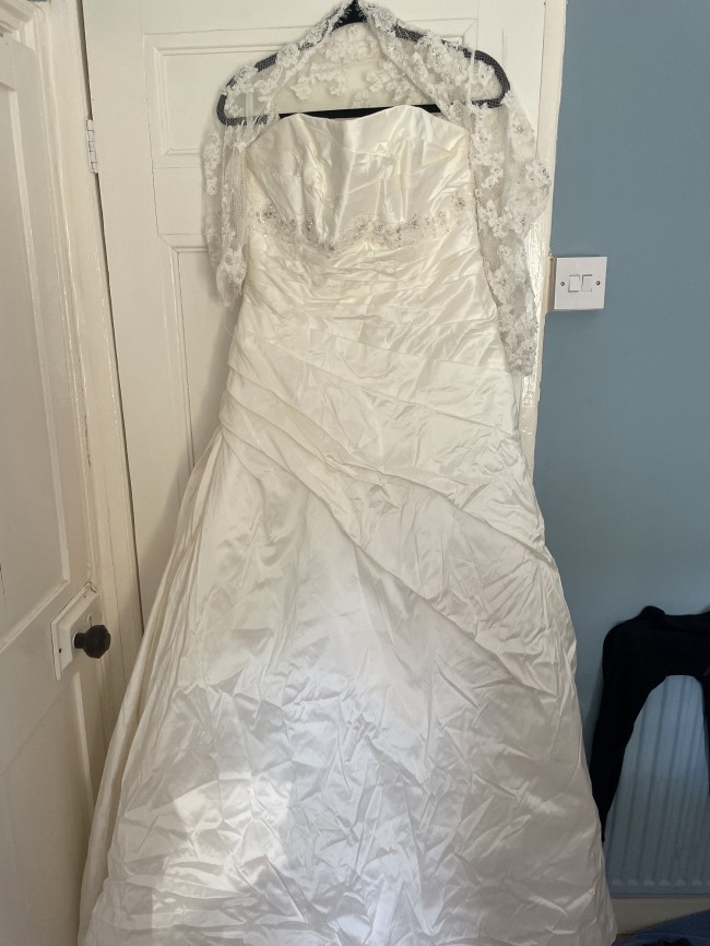 Intricate beading, embroidery, and sequins adorn the dress. The strapless design has a Valero jacket to match. Completing the look is a delicate veil if you wish to have this aswell.