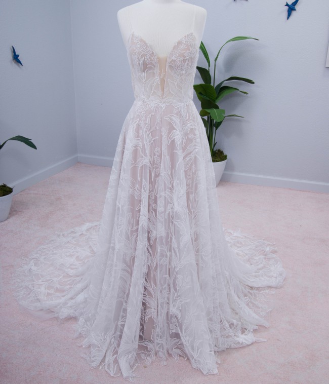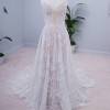 Info from the designer: Introducing Dune, a love story in herself. Thin tulle straps create casual ease reciprocated by the large floral lace falling across the gown. With an a-line skirt full of movement, she is romantic from start to finish. Delivering that wow moment in the back, Dune details an illusion scoop bodice with gorgeous sheet lace flowing through to a 30” train. The perfect statement train for the bride who loves to leave a lasting impression.