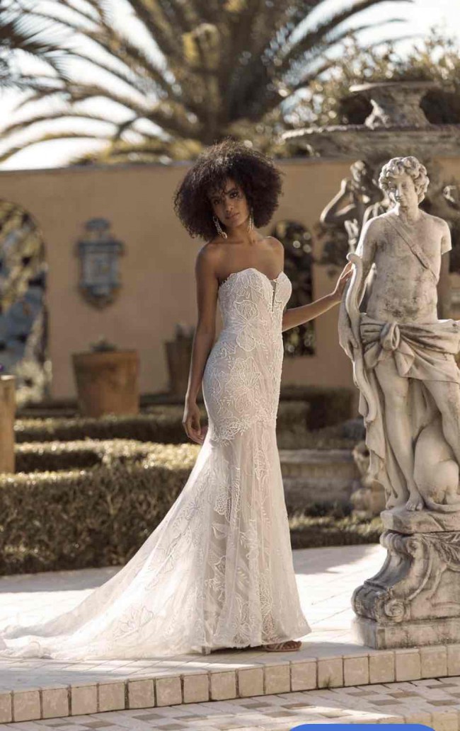 There�s only glamour to behold when taking in Bryce. Her sophistication is enchanting as she moves throughout the blossoming arbors adding to her charm. Her sweetheart neckline lures your attention as it dips into a modest plunge finished off with a tulle inset to maintain her perfect bodice fit. With her hair swept back into a, to die for, bridal pony, Bryce�s . A design which allows her bride to personalise her look with adorning sleeves or take a more traditional style and maintain simplicity with a sweetheart strapless neckline. She�s for the bride looking to be bold with her statement lace of abstract florals moving sinuously across the fitted upper skirt before flowing into a relaxed flare and pooling behind into a generous train. Store sample may need freshening up no sleeves