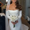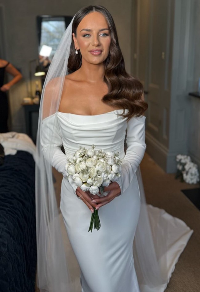 Winter features in demand, long, off-the-shoulder crepe sleeves, which have been intricately designed and perfected by our team over time to flatter every bride.