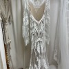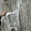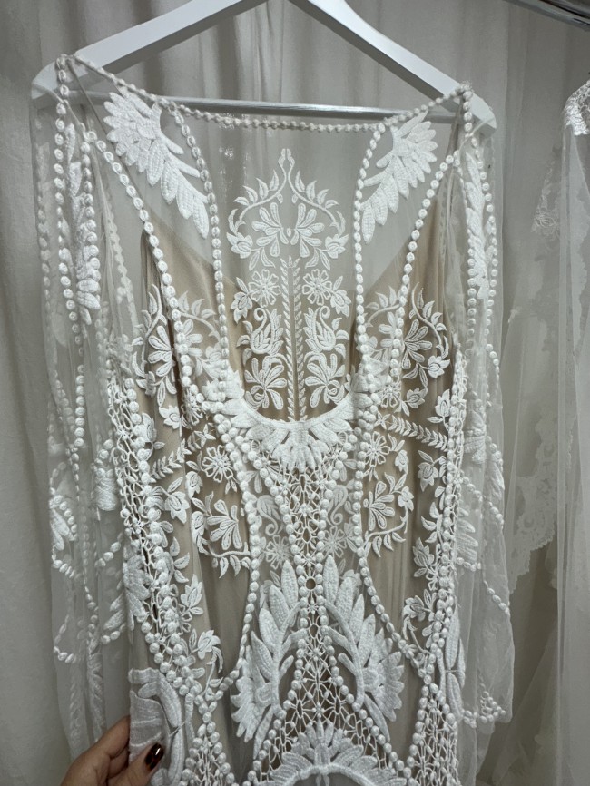Stevie Nicks vibe . High neck with belled sleeve in lace with a clay liner to accentuate the ivory lace .