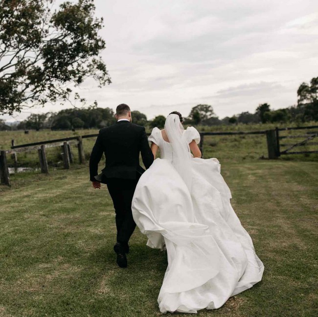 Bronte Gown by Wona Concept Altered to a size 12-14 AU Height of bride pictured - 168cm with 6cm heels Has been professionally dry cleaned - stains at the bottom of the dress & train (pictured) (stains could be trimmed off if not wanting a long train) The Bronte gown is made of glossy mikado fabric and has no additional decorations. The corset is embellished with delicate boat neckline and has beautiful puffy sleeves. The magnificent skirt falls straight and has a long train.