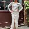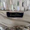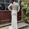 This high octane gown was designed by British designer and occasion-wear specialist Jenny Packham in the early 2010s and was probably part of a bridal or resort collection. Tailored from pale champagne silk with a semi-sheer finish, the silhouette is incredibly flattering, skimming the body and giving way to a graceful train at the back. A high slit in the front for the skirt breaks up the solid construction. The wide neckline adds to the classic elegance, revealing the collarbones. True to Packham’s signature glamorous style, this gown is smothered in iridescent rectangular palette sequins and dotted with rhinestones. Beginning at the right shoulder, these high-shine adornments are masterfully adorned to appear to fade as they cascade down the body, resulting in a glistening mirror ball effect as the wearer moves. It fastens down the side under the left arm with a tonal hidden zip.