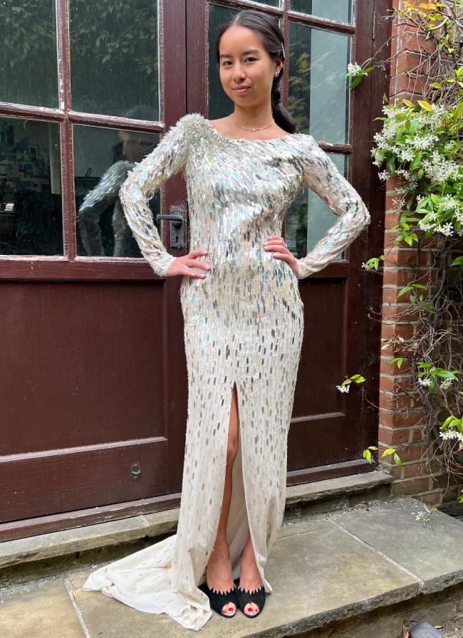 The dress is in very good to excellent gently worn condition with no issues of any note. We have carefully reattached any hanging palette sequins and beadwork but a dress like this will always have a very tiny number missing in a few places. The size and composition label have been removed, presumably for comfort. The dress has a tiny bit of stretch on the below measurements. Our model is a UK 6-8 and 5ft 4in (163cm) and this dress was a good fit on her with no room to spare on the hip.