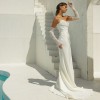where chic meets romance in a sleek strapless crepe gown. Crafted to perfection, this gown features a structured sweetheart neckline adorned with draped bodice details, embellished in textured organza for a touch of ethereal charm. Delicate ruching along the waistline adds graceful definition, enhancing the silhouette with understated allure and feminine sophistication.