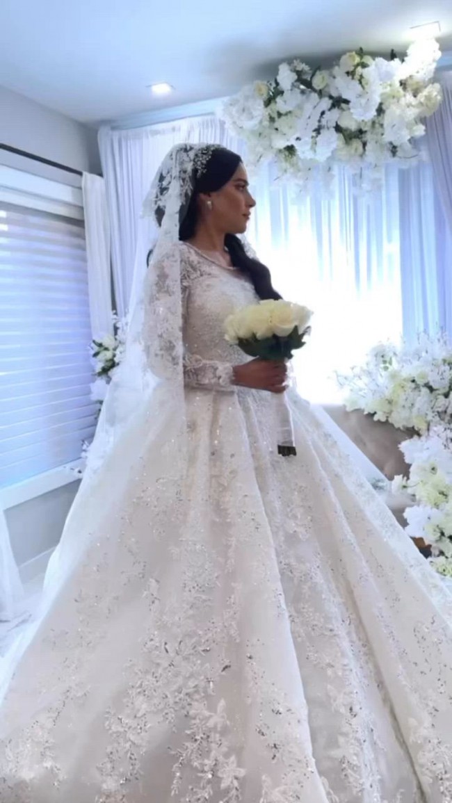 This enchanting ballgown by Sena Masoud is waiting to make another bride's dream come true. Crafted with love and intricate attention to detail, this stunning dress features a striking silhouette that accentuates curves and creates a fairytale-like aura. The pristine white fabric is adorned with 3D flowers, delicate beads, shimmering crystals, and exquisite embroidery that catch the light beautifully, making you the focal point of your special day.