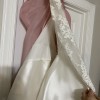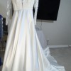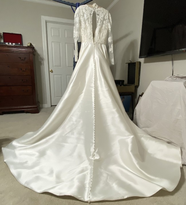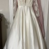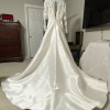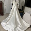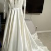 This long sleeve bridal dress by Sherri Hill will have you falling in love all over again. This elegant bodice showcases a deep v neckline and long sheer sleeves. The bodice and sleeves are adorn with gorgeous lace appliques. The high back is completely sheer with matching lace appliques. The long a line skirt is made from amazing taffeta material.