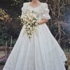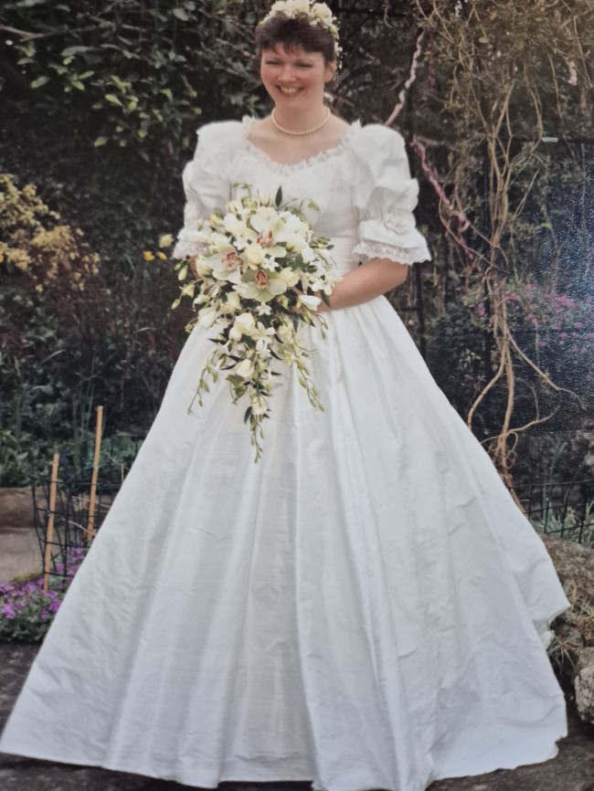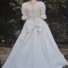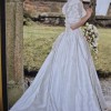 Made from ivory coloured silk with a simple design with a 'rose' design on each sleeve. Short train which can be pulled up and secured for dancing.