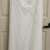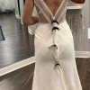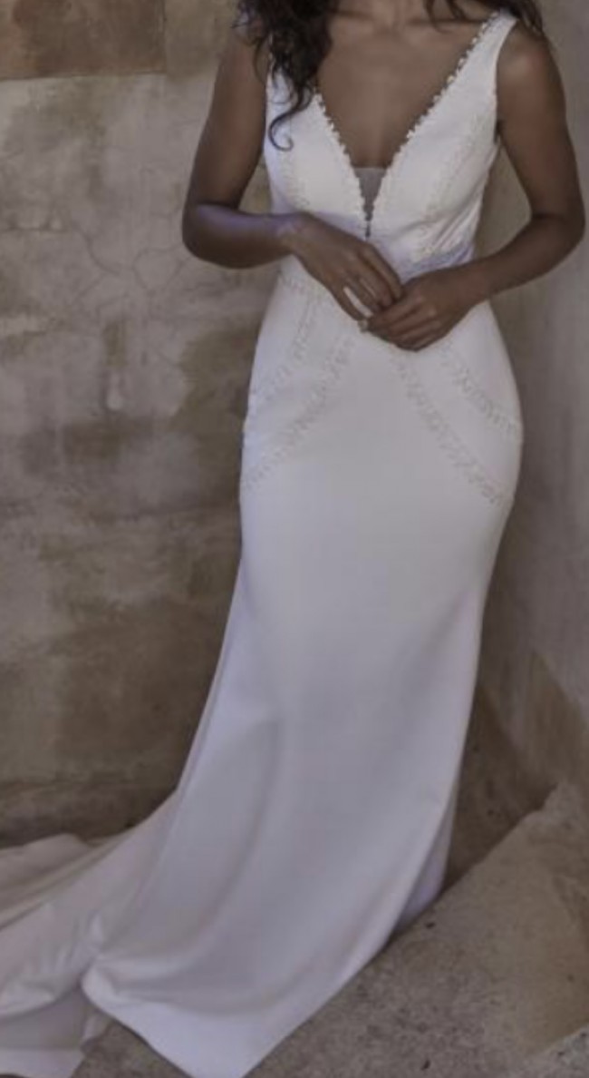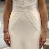 Evie young bridal dress ivory fit and flare gown store sample means that it had been tried on This is a soft fit and flare silhouette accentuating curves. The neckline bodice edges are detailed with lace trim that continues throughout the dress design. The back of the dress really sets it apart with the lace trim detail is modern and beautiful!