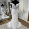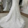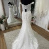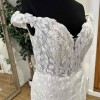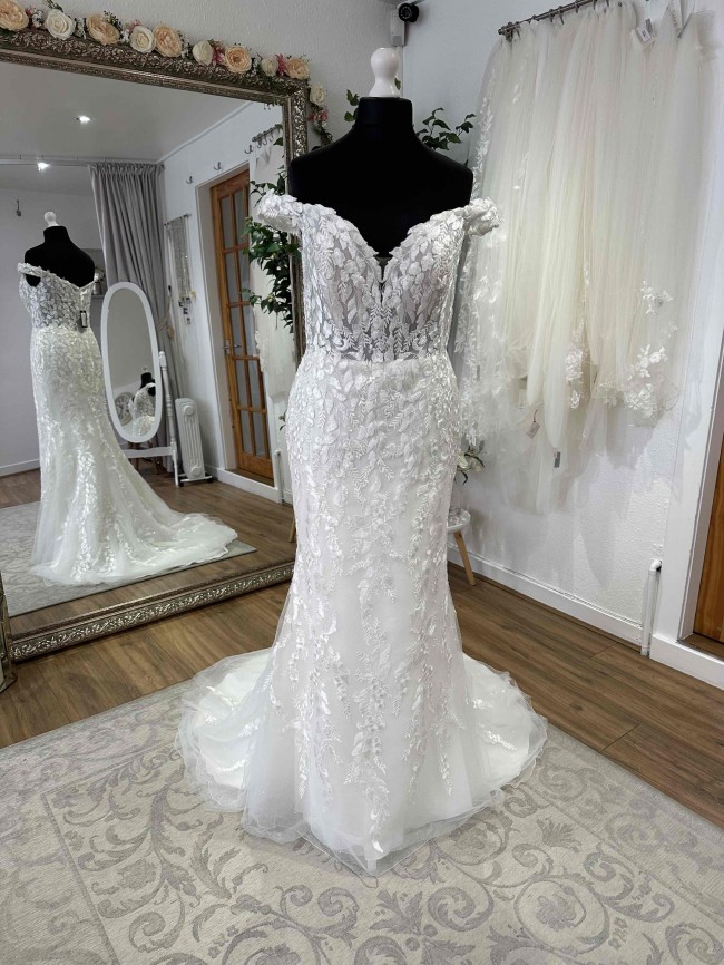 Beautiful floral/ leafy lace fit and flare. Off the shoulder with a mid/ high back. Extremely supportive bodice and gives a good shape. Sparkly sequin tulle under layer. Sweep length train. Bridal boutique sample dress so completely unaltered and in immaculate condition.