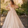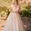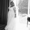 Discretely sparkled fauna lace applique featured on the tulle ball gown is a classically romantic look. The V-neckline is created by the illusion lace straps that continues to the back where a corset draws to a chapel train. A discreet floral sparkle underlay to the tulle full skirt sparkles as you move. We have added a ¾ sleeve, this can be attached or on poppers to create two different looks for your big day