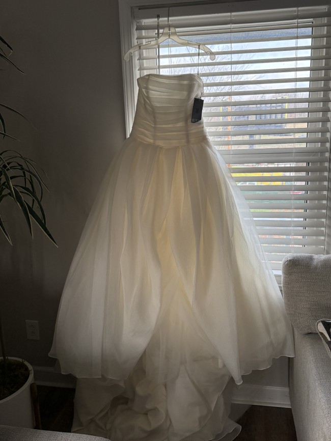 This exquisite Vera Wang White wedding dress, model VW351178, captures the essence of timeless elegance and modern romance. Crafted in size 10, this A-Line silhouette beautifully flatters the figure while offering freedom of movement, making it perfect for a day filled with celebration and joy. The straight neckline adds a subtle sophistication, harmonizing seamlessly with the strapless design that showcases your shoulders and collarbone.