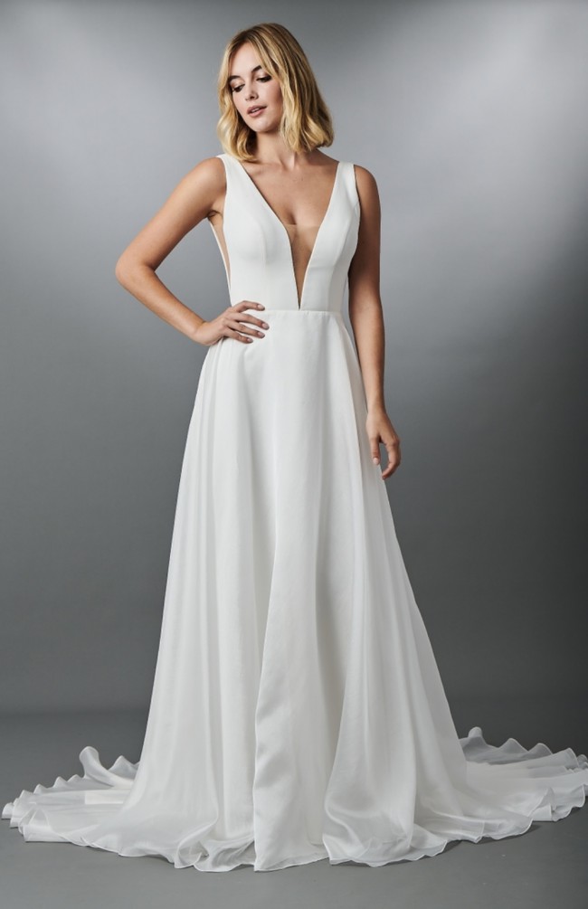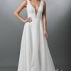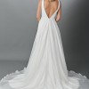 Crepe and satin faced chiffon A-line gown. Brand new with no alterations.