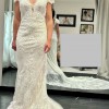 This Rosa Clara Negara dress is the epitome of timeless elegance. Purchased directly from the Rosa Clara bridal boutique in Madrid, this gown has never been worn, still has its original tags, and it is unaltered - a perfect, pristine piece ready to make a statement. This is a sexy mermaid-style wedding dress with deep-plunge neckline and buttoned back with dot tulle and lace with short sleeves.
