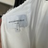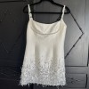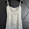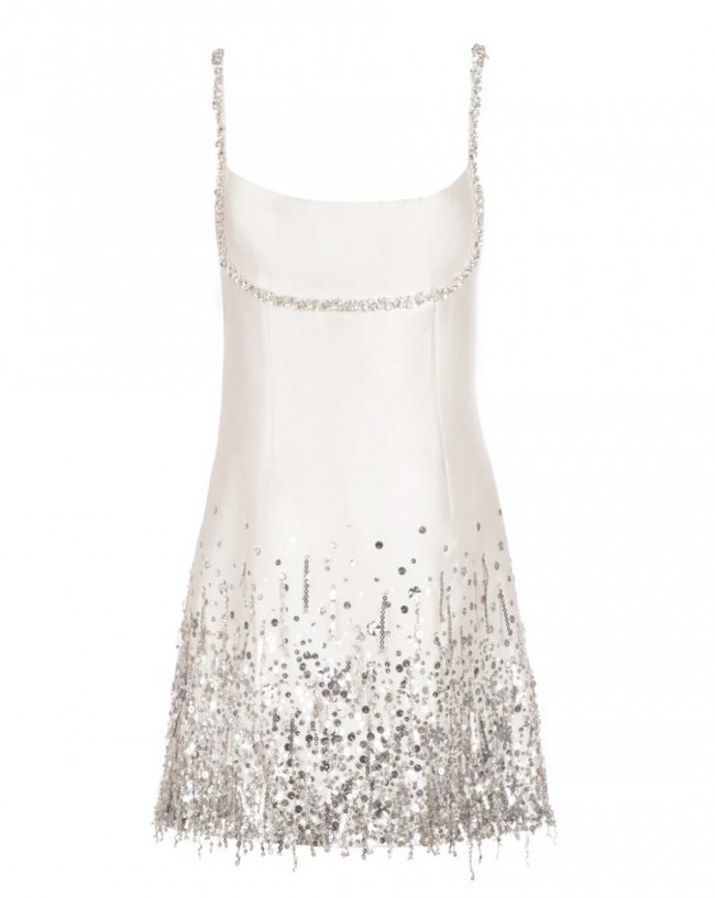 This made to order slim cut mini dress features crystal detailing around the neckline and silver sequins, fringes, and flowers that degrade up from the hem. Invisible zipper closure. Crystal detailing around neckline. Silver sequin beading at hem.