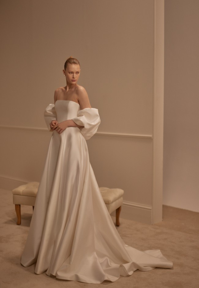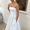 This brand new gown is absolutely perfect. Straight across neckline, flattering a-line seams, full corset structure on the inside and real covered buttons on back. This gown is from a 2025 collection. Act fast.