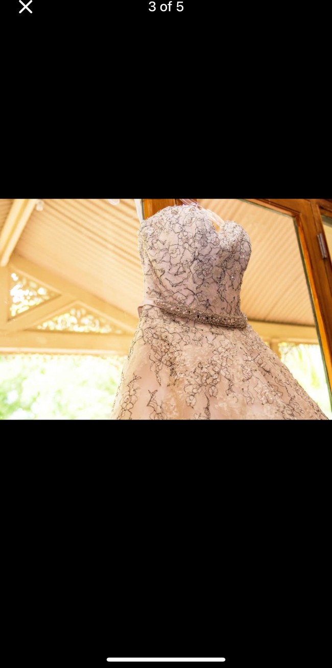 This stunning A-line Sophia Tolli gown features intricate lace detailing, a flattering sweetheart neckline, and a sparkling embellished belt for an elegant touch. The dress is in beautiful used condition, professionally dry cleaned and ready to wear. Its timeless silhouette and delicate embroidery make it perfect for a fairytale wedding. Asking $1500.