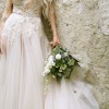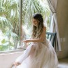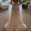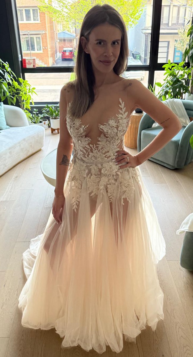 The first two photos and the video were taken months after the wedding, following professional cleaning. The dress is in excellent condition. The tulle will need a gentle steam to remove creases at bottom due to storage. The illusion top is raw cut along shoulder/neckline and might need slight re-trimming to preserve the crisp edge ahead of the big day.