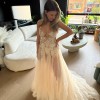 Stunning transparent tulle skirt layered over an intricately detailed bodice adorned with pearls, sequins, sparkles, and lace. Features an illusion neckline and open back, accented by a delicate rhinestone belt at the waist. The skirt is made of multiple layers of soft tulle in varying shades, flowing into a breathtaking train.