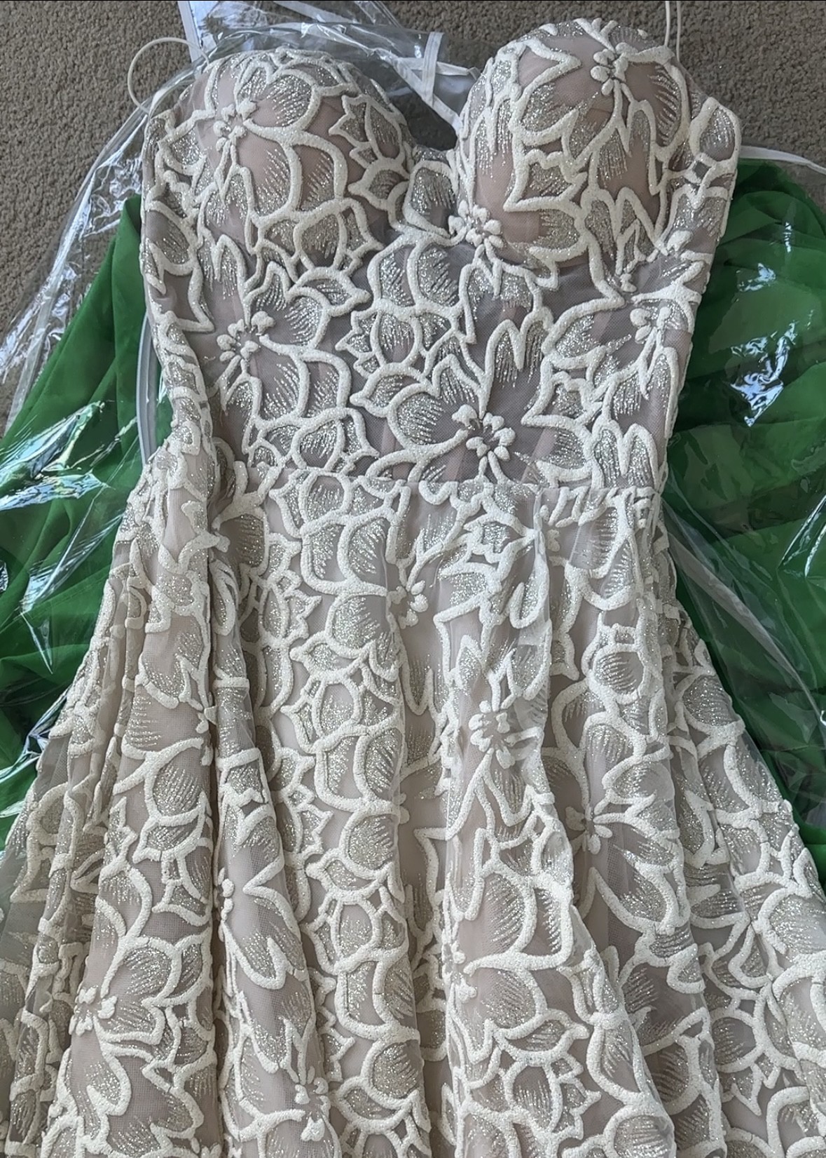 I am still obsessed with this dress, it is like nothing else that's out there which makes it very special. The flowers are a thick glittery material. This dress will make you feel like a princess. I ended up purchasing this for $800 plus shipping and try-on fee so I just want to make some of the money back.