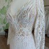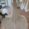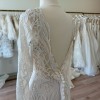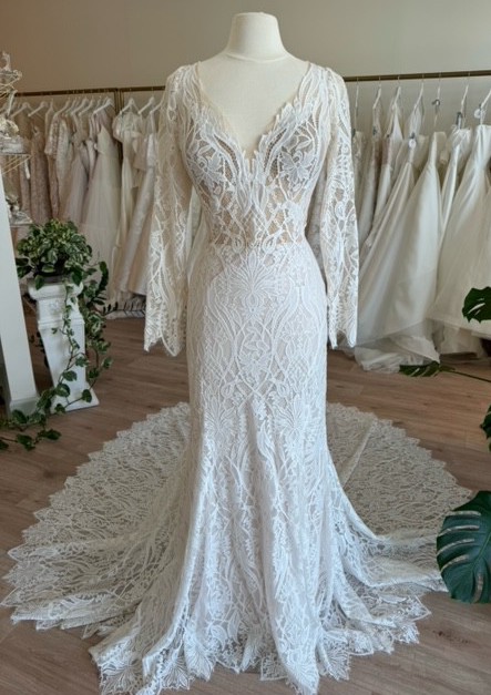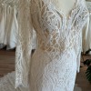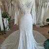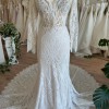The sophisticated V-neckline elegantly frames your décolletage, while the long sleeves add a touch of timeless charm. The low back opens to an alluring reveal, ensuring all eyes are on you from every angle. Floor-length and utterly breathtaking, this gown sweeps gently around you, creating a mesmerizing effect as you walk down the aisle.