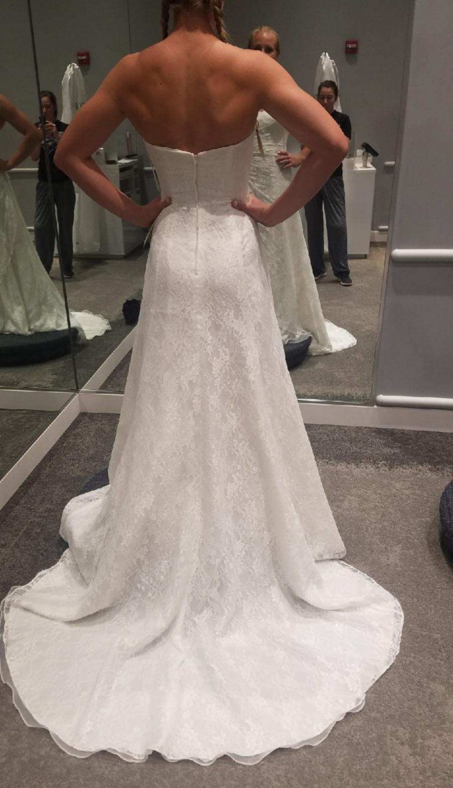 This exquisite A-line wedding dress from David's Bridal was the perfect choice for my dream day. The soft ivory lace has a delicate elegance that made me feel beautiful and confident as I walked down the aisle. The sweetheart neckline accentuates the décolletage beautifully while providing a romantic touch, and the strapless design allows for seamless movement and comfort.