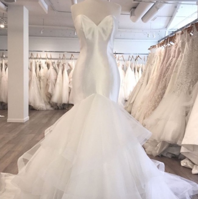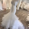 Beautiful fitted ivory dress with detachable tulle sleeves to match the bottom portion. Dress was originally a size 14 with tailored alterations measurements are Bust: 36 ( with inserted cups to allow flawless strapless look) waist: 32 and Hips:40