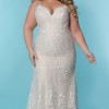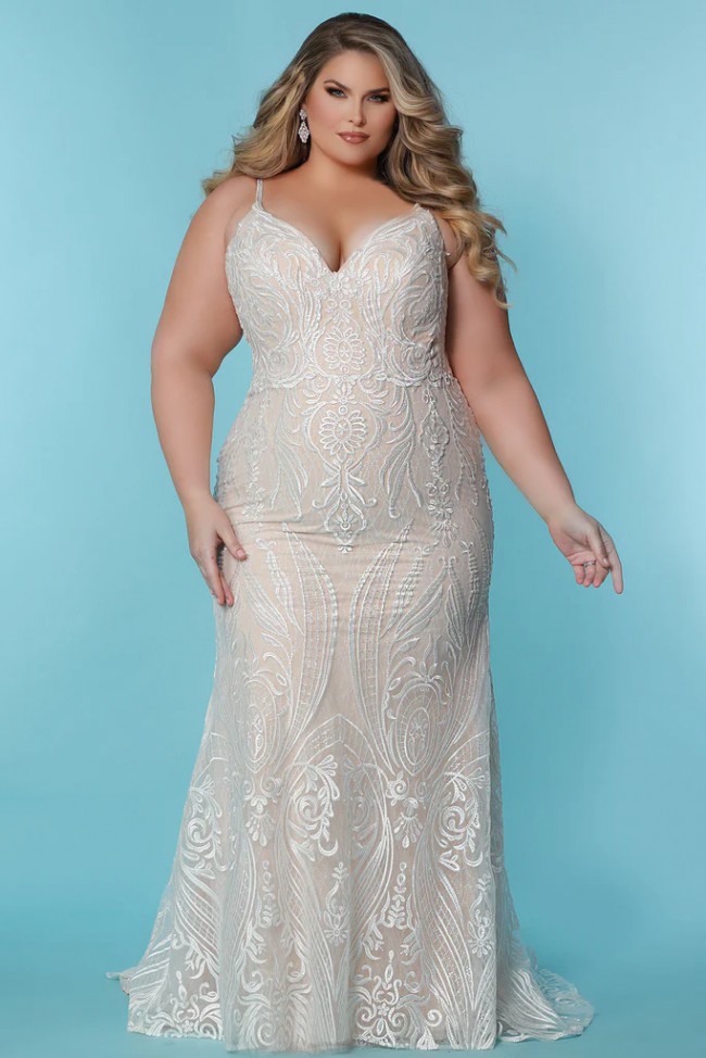 This SC5287 Jolene wedding dress by Sydney’s Closet embodies the perfect blend of elegance and romance. Crafted in a classic sheath silhouette, it hugs your curves while offering a stunning visual with its low back and delicate spaghetti straps. The flattering V-neckline enhances your décolletage, making it an exquisite choice for any bride wanting to make a statement on her special day.