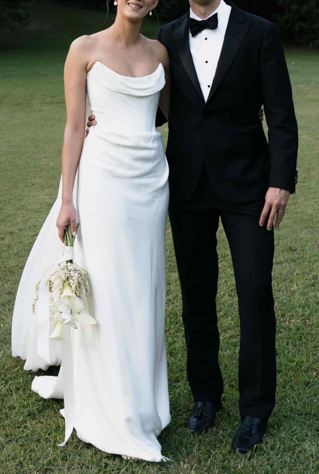 A classic and timeless Vivienne Westwood gown, no alterations have been made. It was an actual dream to wear this dress, so incredible! The dress is made from pearl white FSC-certified crepe satin, with a contrasting silk georgette drape across the décolletage, certified as organic, and a 18th-century style train. The cape is a beautiful silk fabric, that is detachable. Both dress and cape are in perfect condition and have been dry cleaned. There are 2 small faint marks on the bottom of the train at the back of the dress which are only noticeable when holding the dress to your face. If you required the dress to be hemmed, it would only need 2.5cm taken before the marks were completely removed. Please message if you have any questions or would like more photos x