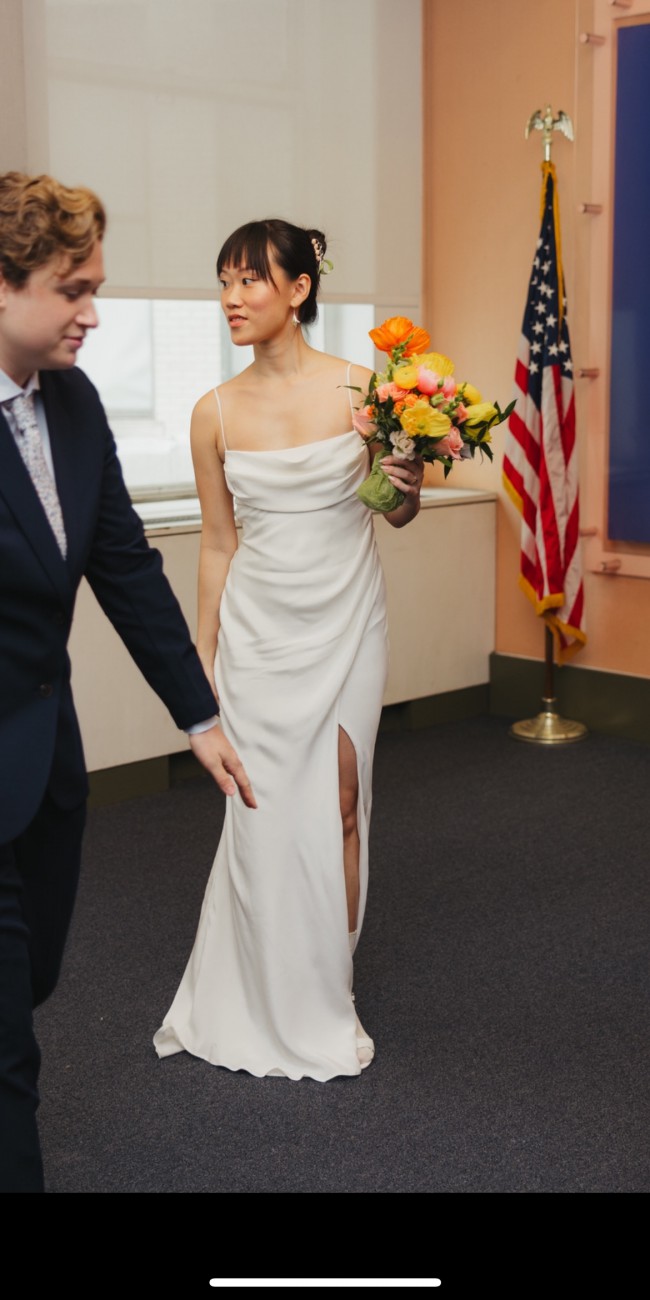 Bella dress in Size 4! This dress custom made to these measurements Bust: 89.5cm Underbust: 80.5cm Waist: 73cm Hip: 99.5cm Shoulder to floor: 141.5cm 80cm train + finger loop. I added a bustle so you can button up the train so it's easier to move in. Full disclosure: There are two very minor flaws that you can't tell when wearing it nor will it show up on photos. 1) The french seam along one side of the dress was not perfectly made, so there's a very tiny bit of fabric sticking out. 2) I stepped on some grass during the wedding and there's the faintest leftover stain along the train after dry cleaning. It's really not noticeable at all, but just wanted to be honest here!