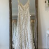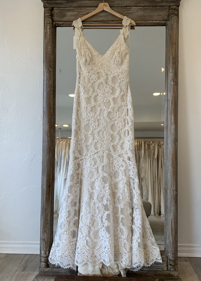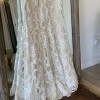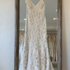 A beautiful romantic ivory re embroidered lace mermaid style dress. Lined in platinum color silk with scalloped hem and delicate guipure lace with trim on shoulders. Dress is a shop sample that has been tried on but is still in really great condition. A little TLC on the shoulder lace to reinforce but other than that dress is in great condition. Can send additional photos if needed and happy to answer any questions …