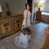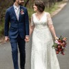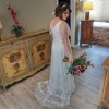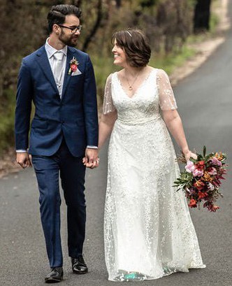 Designed by Erin Clare of the Sunshine Coast, the Sophie dress has a V neck and back with layers of embroidered tulle over a white underlay. Fitted at the waist and flows out (no need for spanks!). I had soft sleeves added.
