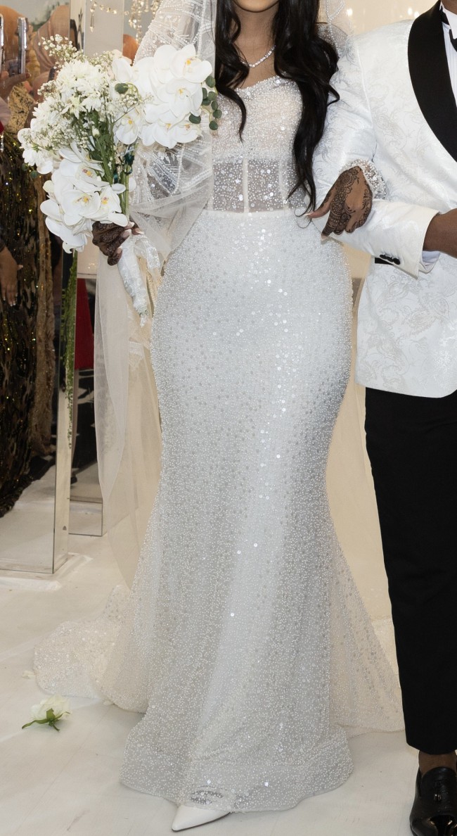 I have purchased the dress from raffaele ciuca, the sleeve is detachable and the dress has a train. It also comes with a custom made veil. The size is 10-12.