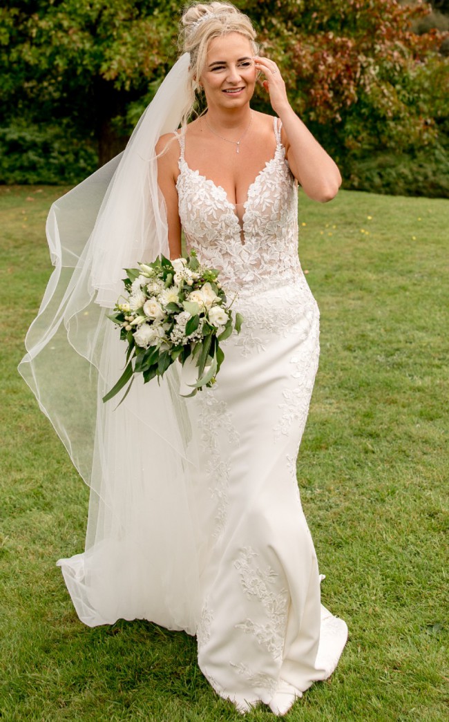 Lace trails down the flare of the skirt at the front before softly continuing to the hem, adding texture.