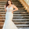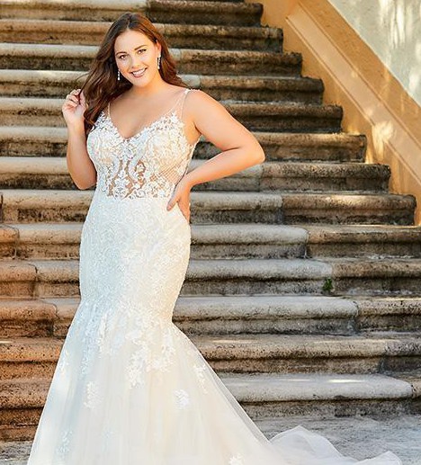 This stunning dress from House of Wu is the epitome of elegance and sophistication, perfect for making a memorable entrance on your special day. The timeless ivory shade enhances the romantic mermaid silhouette, hugging your curves in all the right places. The sophisticated V-neckline beautifully frames your décolletage while the sheer back adds a touch of allure, offering an unforgettable rear view.