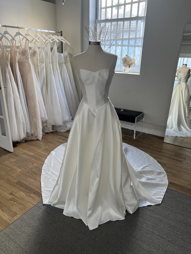 Brand new, unaltered, still in the original bag, Flora Valentina - I knew that I couldn't keep this dress even before it arrived, since our wedding is no longer happening as planned, so I haven't even tried it on my body yet. Sad but hope I can find her a new home! I had the bridal salespeople help me take photos on their dress form, so it literally hasn't even been out of its storage but to take these. They're babysitting it in its original packaging at the salon on the rack for me in Manhattan until I find a buyer. So consider this a literal brand new Flora!