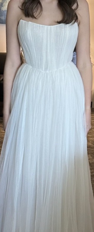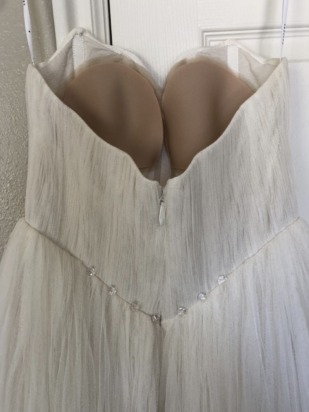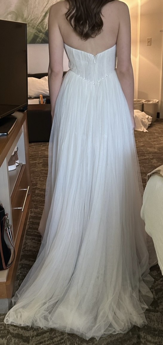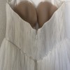 Worn once and dry cleaned! Only alteration is hemming and addition of bustle with clear beads (in photo and video) - waist and bust were not altered. Created for 5'7" height wearing 2" heels.