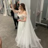 This stunning Galina Signature wedding dress captures the essence of romance and elegance with its enchanting A-line silhouette. The off-the-shoulder neckline beautifully accentuates the shoulders, creating a timeless and sophisticated look that is both alluring and graceful. The soft chiffon fabric flows effortlessly, ensuring you feel comfortable as you glide down the aisle.
