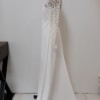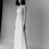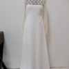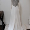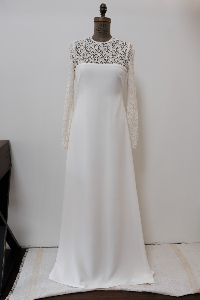 Effortless long sleeve lace wedding dress with a slight A-line silhouette and subtle train in a buttery soft silk crepe. Gown is a store sample, in excellent/new condition, unworn/unaltered.