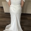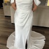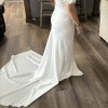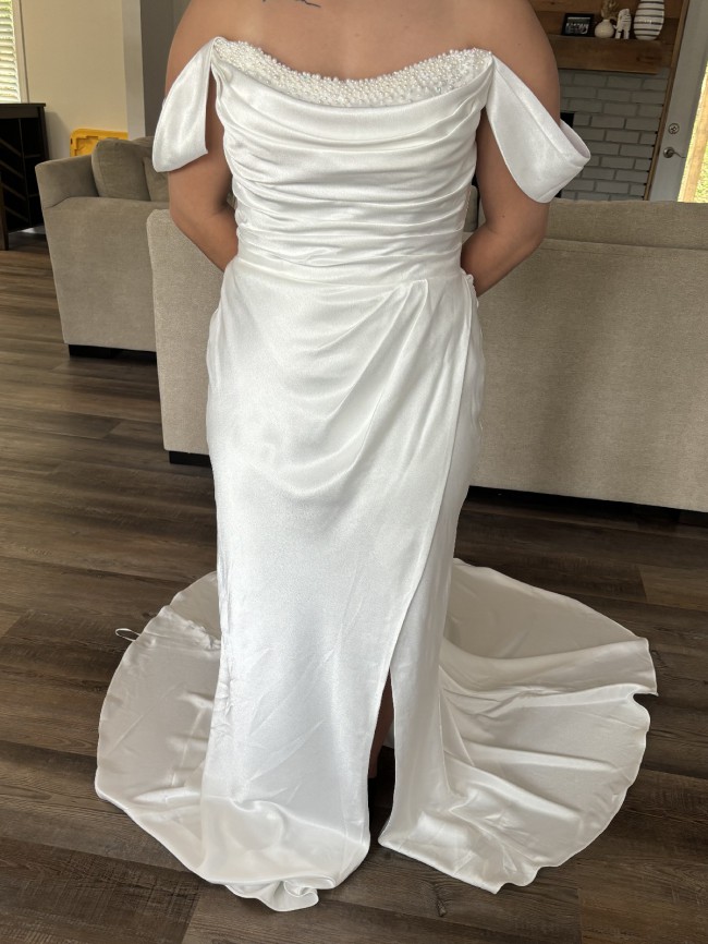 Brand new, only worn twice when trying on. The top fits nicely with a hidden corset inside. I never thought I would want a “strapless” dress but this feels like it could stay up all night long without constantly pulling it up. Back has a zipper closure. Cute off the shoulder sleeves that can be removed if wanted. The neckline is lined with beautiful pearls. There is a slit on the L leg. I bought this dress because I loved it and how extremely comfortable it was. You could easily wear this dress all night long without getting too hot. The train has a button for bustling. I love this dress but I found one that felt more like me.