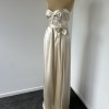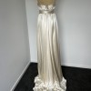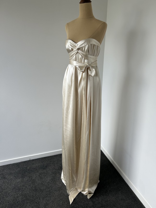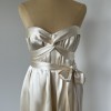 Heavy vintage silk, corseted, strapless gown with feature torso and bust ties wrapping around waistline.