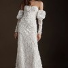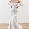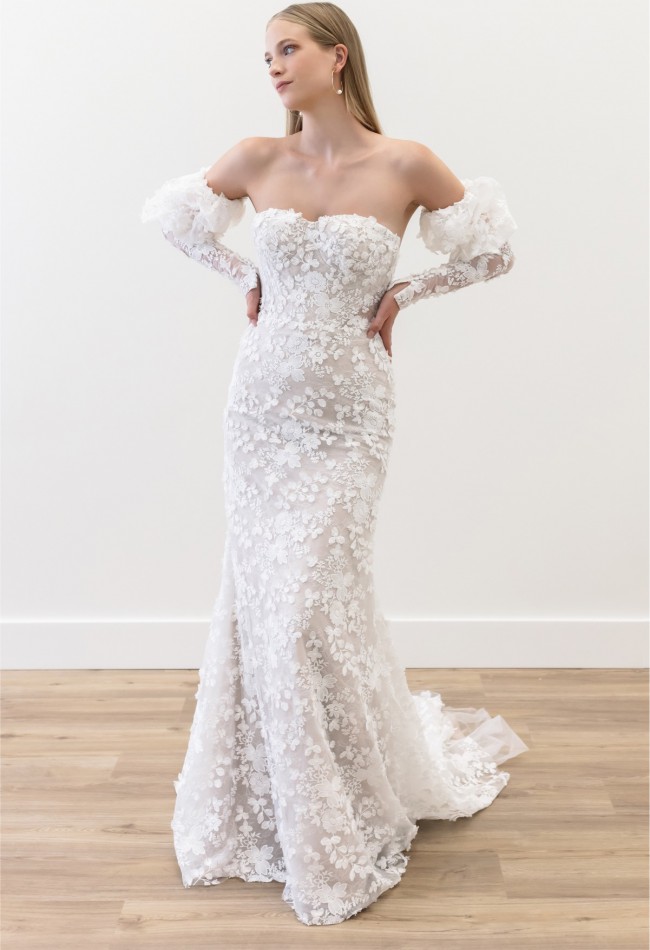 Stroll the aisle in ornate opulence, care of the Willowby by Watters Cecilia Wedding Gown. Dramatic, off-the-shoulder puffed sleeves compliment a sweetheart neckline and fitted bodice. For a sleek second look, remove the sleeves to accentuate the stunning strapless corset. Featuring allover floral lace and a chapel train, this convertible sheath gown makes an enchanting choice.