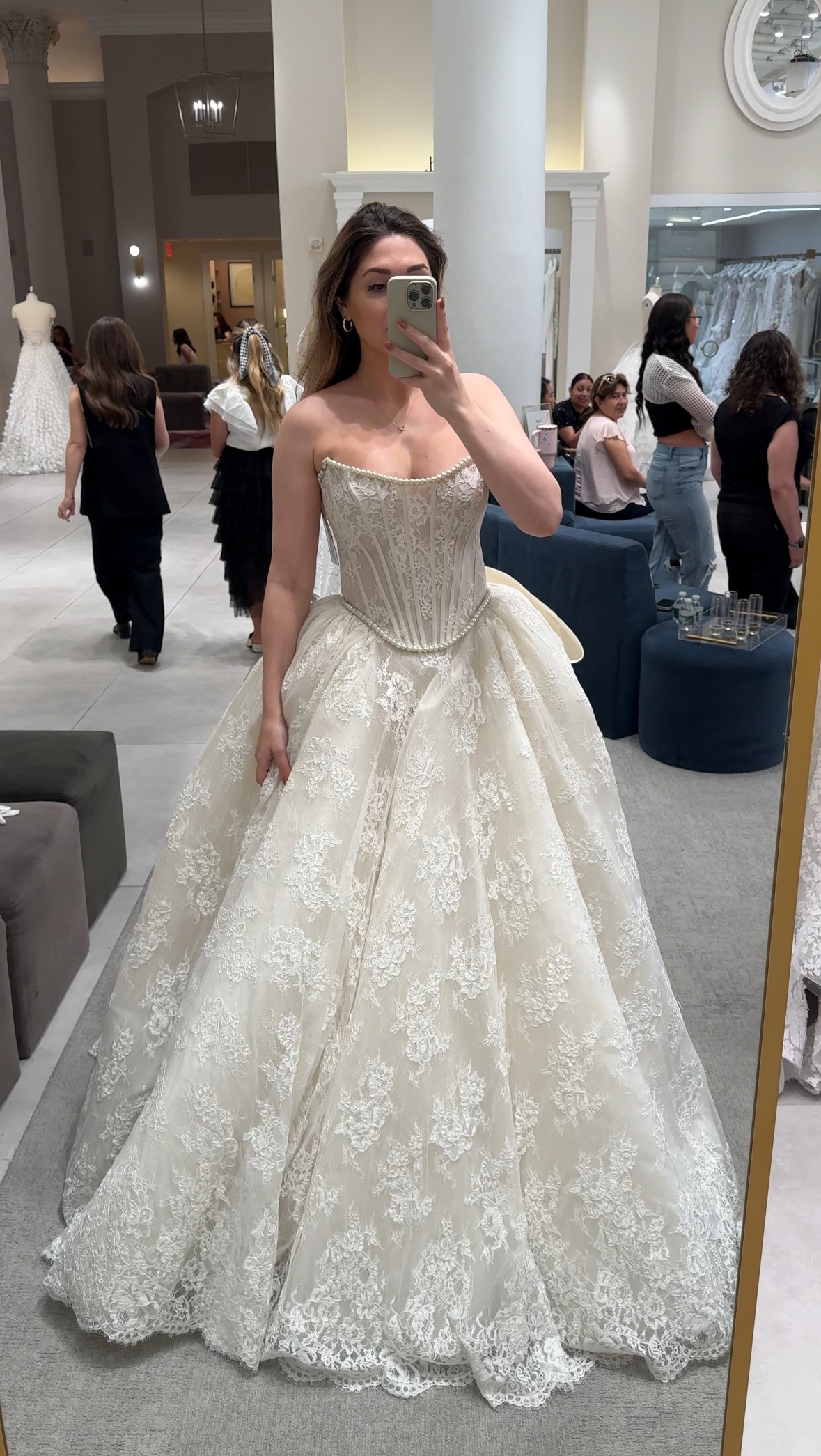 Purchased this BRAND-NEW at Kleinfeld in NYC, but had also bought another wedding dress and decided to wear that one instead. This has never been worn. Comes in all original packaging with original tags.